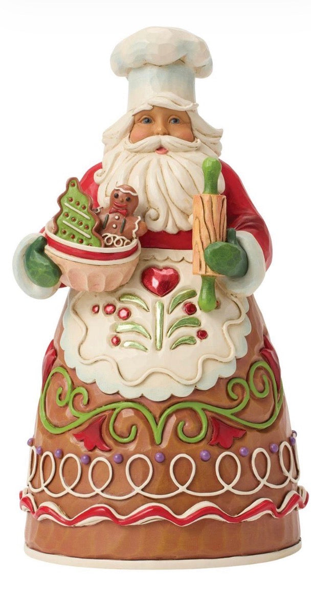 Dressed in a chef's hat and apron, this gingerbread Santa is ready to bake up Christmas joy. Jim Shore's playful patterns and candy-like details give the design a delightful, sugar-coated charm. A treat for both collectors and holiday kitchens alike.