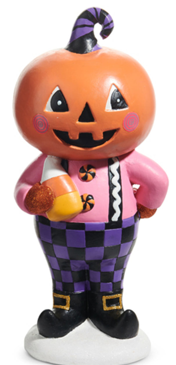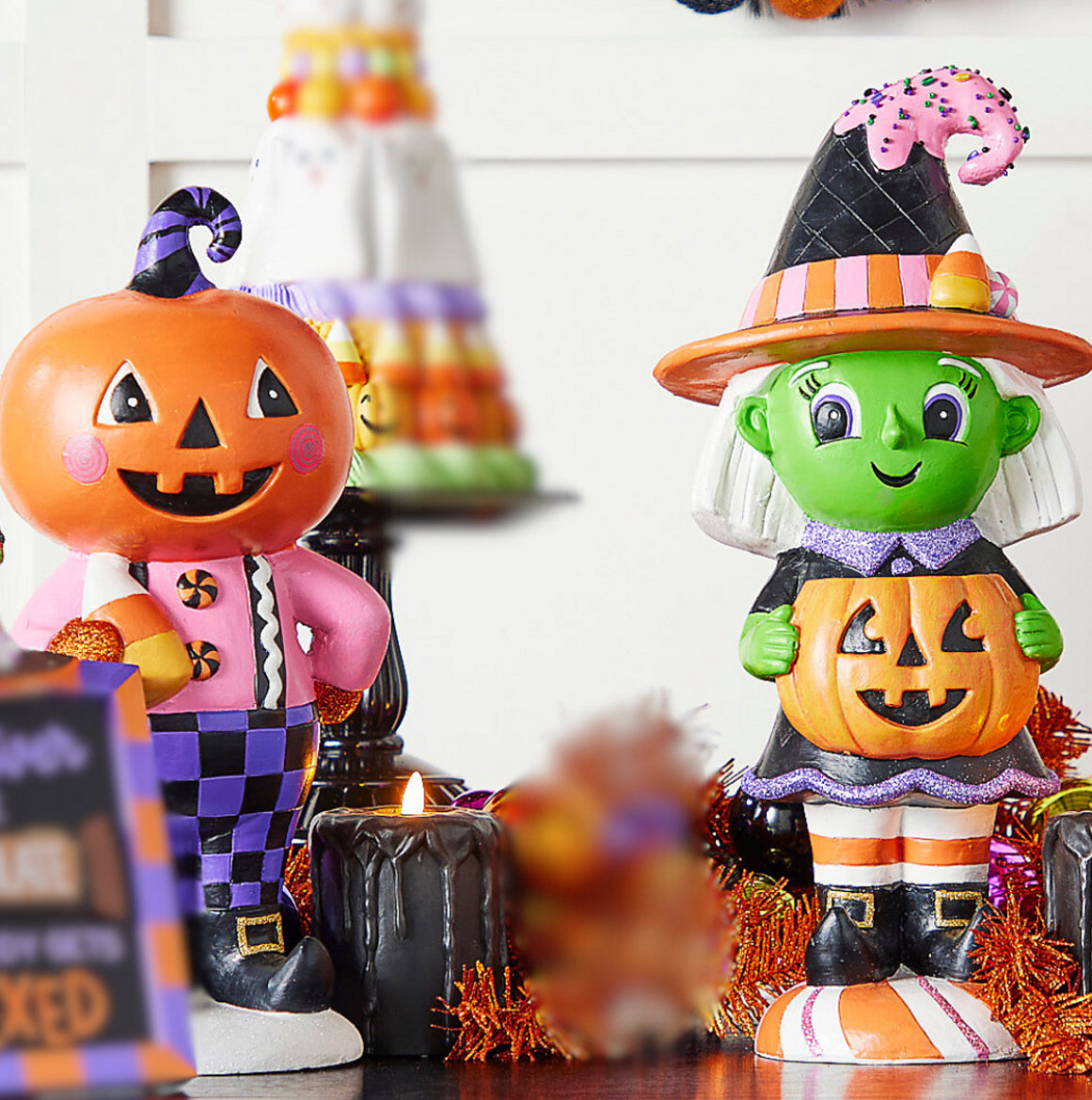 Choose the witch with her green skin, sprinkle-topped hat, and jack-o’-lantern, or pick Mr. Pumpkin holding his giant candy corn. Made by Raz Imports from paper and plastic — perfect for a playful Halloween display!