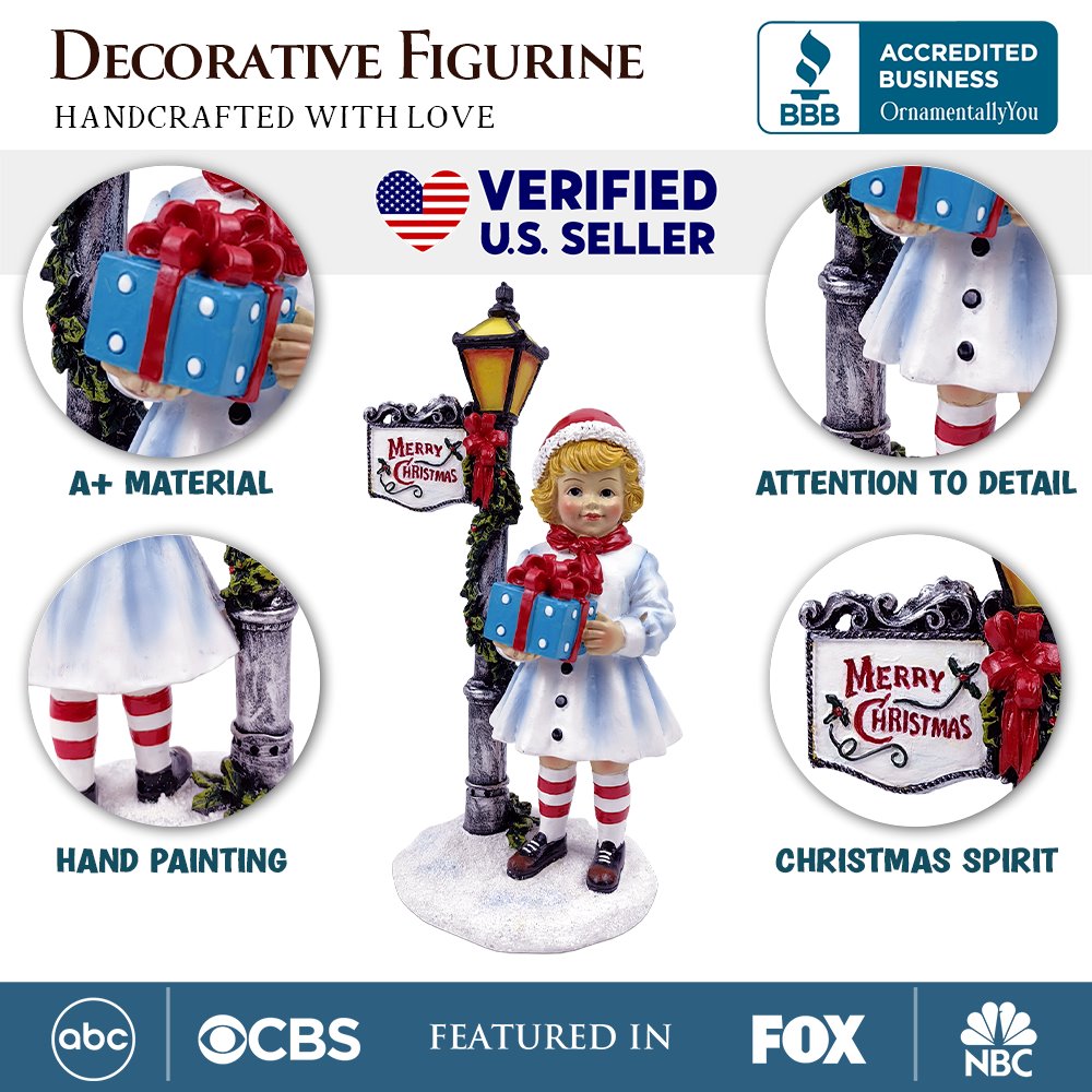 Victorian Style Christmas Girl and Street Lamp Tabletop Figurine, 8" Vintage Holiday Statue of a Gift Carrying Belle